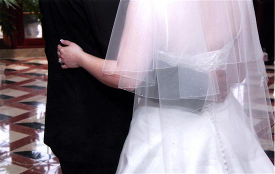 I couldn't afford a Thomas Knoell tiara, so I promised myself that I would splurge and get a veil from them. Well, I spent almost as much on the veil as I would have on a tiara, but it was TOTALLY worth it. The veil was important to me. I wanted sheer so that you could see my updo, but very poofy. I had a vision of what I wanted my veil to be, so I am glad that I went to the experts. Thomas and his wife Raquelle were soooo nice. The saleswoman, although I can't place her name, was so helpful. She just put different veils on me until I found the right one. Then I customized it just for me. I ended up going with a 2-tier waterfall veil. One tier was at my elbows, and the other was at the small of my back. I just loved how it fell. I got it in Ivory, with silver edging, and swarovski crystals scattered on the longer layer, and on the outer edge of the shorter (blusher) layer. That way when my blusher was on, the pictures would not show shiny dots all over my face. This was the suggestion of the saleswoman, and it was just perfect. The veil had a plastic comb, and stayed in with no problem until I took it out (which was about 10:30 pm, after I danced with my dad). It really was my dream veil.