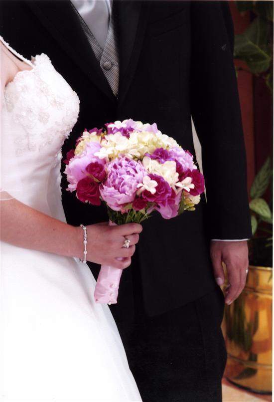 John was truly wonderful to work with. His enthusiasm for flowers, and his need for perfection are just the best possible combination. After looking at a ton of pictures and making up a picture cd for John before our first meeting, I still did not know how to describe the style that I wanted, I only really knew my color scheme. Well, John took my pictures and created a vision of garden elegance. I loved it! He wanted to use hot pink and light pink peonies for my bouquet and centerpieces, and orchids and calla lilies for my BM's bouquets. John was so wonderful to work with, because I really felt like I worked WITH him. He showed me a sample centerpiece, and I wasn't 100% happy with it. But he listened to all of my suggestions, and the centerpiece for the day of the wedding was EXACTLY what I wanted. As for the bouquets, they were gorgeous! I loved mine, and I adored my BM's boquets. The only thing about my bouquet is that I wished the hydrangea were a darker spring green, instead of light green/yellow. But other than that, it was perfection. It was also HUGE, and I loved having such a substantial bouquet. For the guys, we used mini green orchids, and they looked so good! They even sent an extra one, which is good because the ring bearer needed two! My DH's boutineer was a clover, and it was actually a silk flower. This worked out well, because with all the hugging and posing for pictures, the boutineer took some abuse.