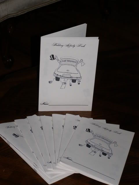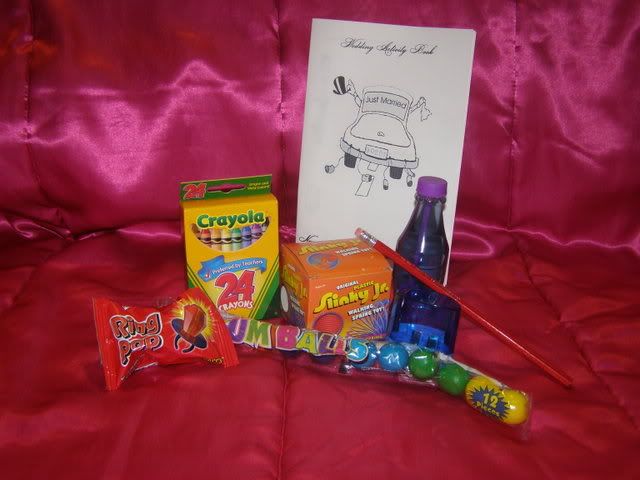 Our jr. groomsman got new stuff for his PSP. Our jr. bridesmaid got a Nintendo DS game and a tote bag with her name on it. Our flower girl got an iPod shuffle, a tiara and a tote bag with her name on it.