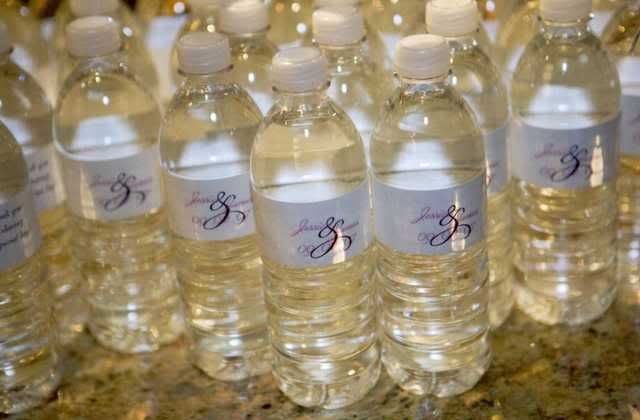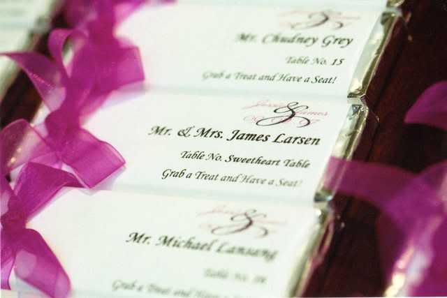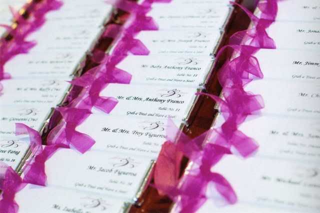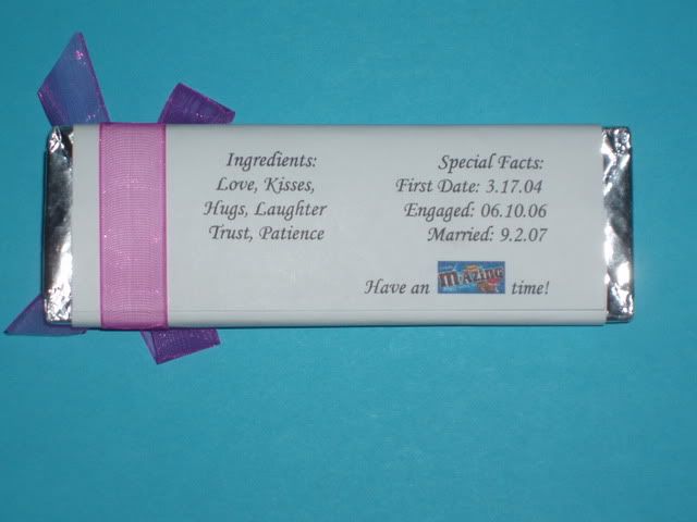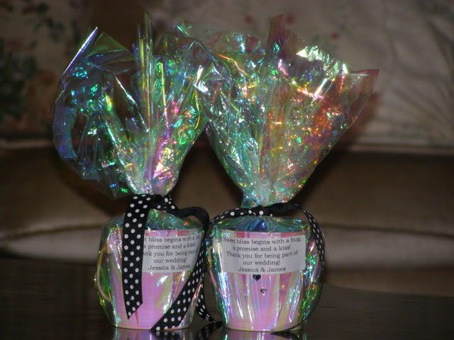 We gave out favors at our rehearsal because there were so many people involved. We wanted everyone to take home a little something. I got the white buckets from the One Spot at Target, the cellophane was from Party City and the chocolates were from Wal-Mart. I printed out labels that read “True bliss begins with a hug, a promise and a kiss” and I filled the buckets with Hershey’s Hugs and Kisses and Dove Promises.