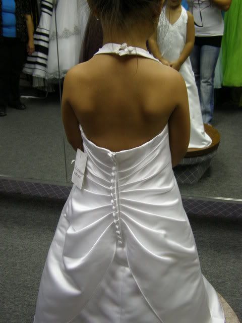 I searched all over for the perfect dress for my niece. I wanted her to look like a mini bride and wanted to show off her back so I looked for a halter dress. There aren’t that many dresses that are full satin. Many dresses had a sheer overlay, a look I wasn’t too crazy about. I found the dress on Brides.com, only to discover that Group USA no longer makes the dress. So I contacted the bridal stores that were on the website. I was able to find the color and size at Camille La Vie in the Palisades Center upstate. I bought it over the phone and it came in less than a week! We got the dress altered at Renate’s by Gigi and she did a fantastic job. My niece looked like a doll. Everyone adored her.