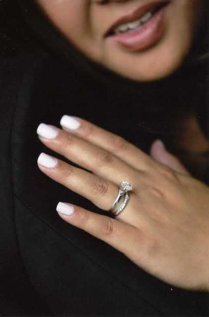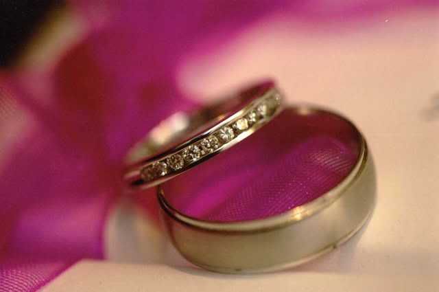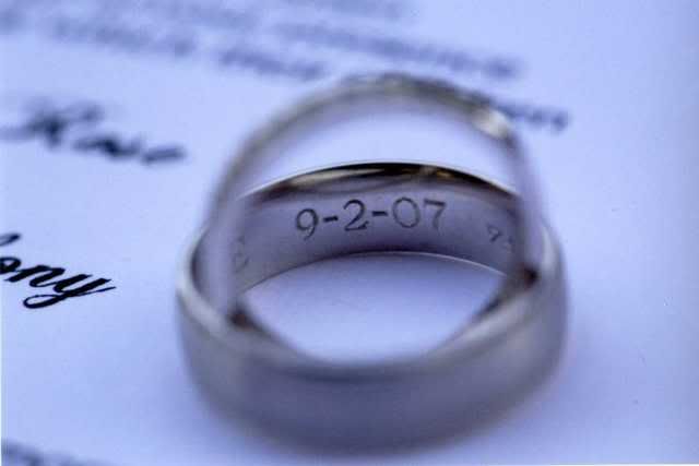 I wanted a solitaire engagement ring and a unique shape. It was hard to find an oval shaped diamond but Mike found it for us at one of Whitehall’s re-mount shows. I wasn’t there so I can’t really tell you how that went. What I can tell you though is that my engagement ring is beautiful!! When it came time to buy our wedding bands, I knew exactly what I wanted. Nothing too fancy, just something that was simple and elegant. It was Jim who didn’t know what he wanted. We are both not very big fans of jewelry so it was really hard. He’s an electrician so he knew he wouldn’t really wear it to work. We ended up getting a titanium band, which is a stronger metal than gold. I got a channel set diamond band in white gold.