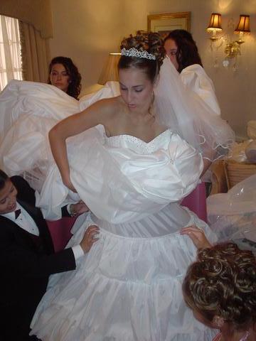 SLIP: A++The Bridal Suite in Centerreach order me the slip I really wanted; a 5 bone slip to give the ballroom appearance. It definitely gave the ballroom effect; however, it was very uncomfortable, so we took the string out and put elastic in. Because of the weight in my dress, the slip kept fall down, causing me to trip.