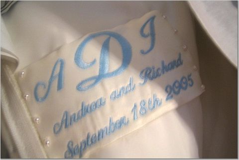 I ordered my something blue – an ivory satin swatch with my monogram and our names and wedding date embroidered in blue. It was gorgeous and such a special personalized touch. Very easy to work with and extremely friendly. When I ordered another swatch for Kimberlybride’s shower they worked so hard to get it to me in time. I highly recommend!
