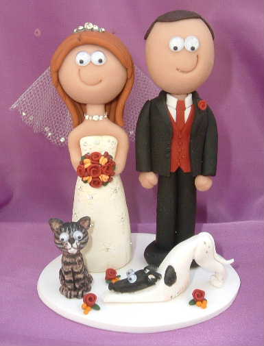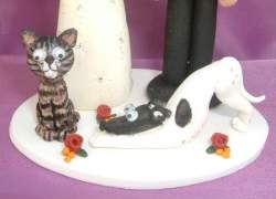 My cake topper was just the cutest thing! I found this vendor on ebay. She is no longer on ebay since she gets so much business just by word of mouth. Patricia makes custom wedding toppers that are very individual and fun. I was able to add my pets to the topper which was very important to me since they could not be there in person. Her email is YtsPtrc @aol.com.