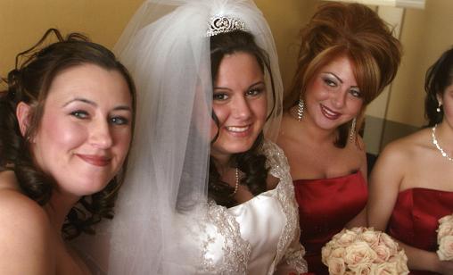 I was lucky ( or so I thought) in the fact that I have not 1 but 2 bridesmaids who are hairdressers. Both offered to do my hair that day but obviously only 1 could. I let the one who had more updo experience do a few trials on me and we came up with 2 hairdos we loved. The first was the down hairstyle I would wear for the ceremony and the other was the updo I would do for the reception. Well that morning my bm ( who was going to do one of my bm's hair, my hair and her own hair) started doing my nieces updo they had decided on. It came out perfect and she was done pretty quickly. Next was my turn. What a disaster!!!! I don't know if she was really nervous or what her problem was that day but my hair was so blah and dull. The curls at the bottom were nice but I could already see they were NOT going to last at all and she couldn't get my tiara to sit straight on my head. I was trying to be patient and hope for the best b/c I didn't want to start getting upset and make her even more nervous but after 15 min of not being able to get my tiara on she put it down on the countertop looked at me and said ' Im sorry I cant do this! See if you can get Jessica ( the other bm hairdresser) to get it in! I was in SHOCK. I was really upset but I wasn't going to start flipping out this early in the day. Thank GOODNESS I was smart enough to Hire Jenn aka Hair genie to do my moms hair and my other bm's hair that day.