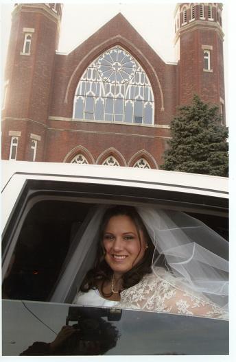 When the second limo finally arrived Mike loaded all my bms into one limo, and me my mom, my moh, and my niece into the other. My mom was shaking from the nerves, my sister looked pale as a ghost and I was....... so calm it was scarey!!! My mom was actually yelling at me ' Why are you so calm' I think I was more calm on the outside then on the inside and Mike our limo driver was FLYING to get me to the church on time. Before I knew it we were pulling off the highway at the exit for the church and he had the horn tooting ' here comes the bride' I was like wow thats me!! So this is what it feels like?!