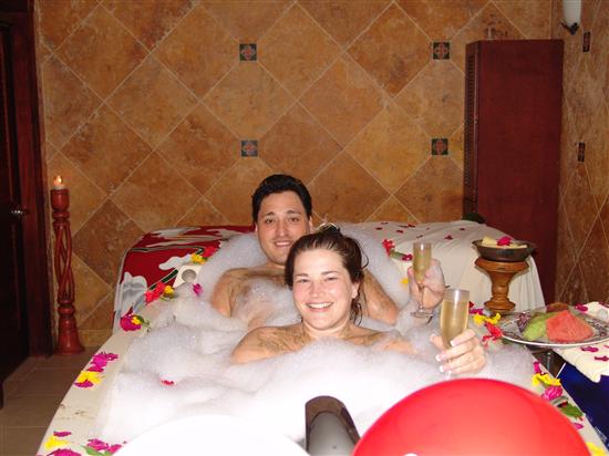 My birthday fell during our honeymoon, so Anthony planned a special day for me. First, it started with breakfast in bed. Then, we went off to the spa and had a couples massage, full body scrub, seaweed wrap, then a bubble bath with fruit and champagne! The spa decorated the rooms with balloons and even had a gift for me! It was incredible! Then, for dinner, our butler arrnaged for us to have a private dinner right on the beach! The waves were a few feet away! It was the most romantic day and night of my life!