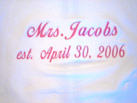 I never saw the point of spending $65 - $110 on something you only get to wear before the wedding and not after. So because of that, instead of getting 'Soon to be Mrs. xxx' I got 'Mrs. xxx Est. April 30, 2006. This way I was able to wear it before and after the wedding.