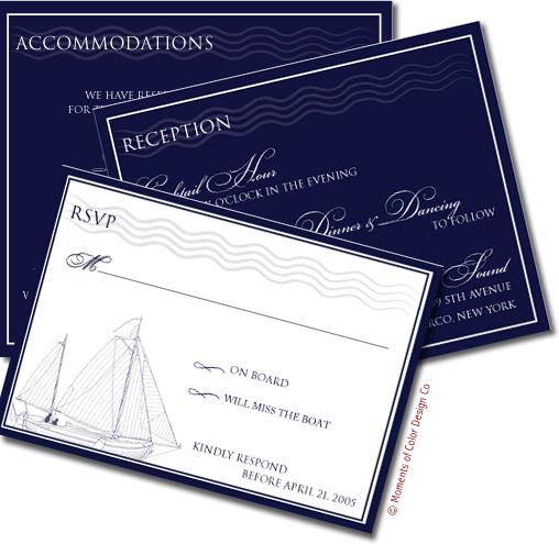 I wanted our invitations to have a nautical compass motif because I thought it would symbolize our new journey in life but I had the hardest time finding anything I liked until Bluesashbride pointed me to Moments of Color (Christian – thank you again!). I hired them to design something that would set the tone for our wedding. Because they are in Australia and the production schedule was long, I had to rely on email communications and couldn’t see my proofs in person. I viewed them instead on a special website. I was a little nervous about trusting my designer with certain details but the invites came out beautifully. We used a print of an antique nautical chart of Port Jefferson, LI (our reception location) to wrap the invite and inserts in. We also had latitude and longitude coordinates of Port Jeff on our envelope seals to personalize our invited even more. We stamped the RSVP cards with a stamp of the USS Constellation. Our guests absolutely loved them and said they were some of the most creative invitations they had ever seen.