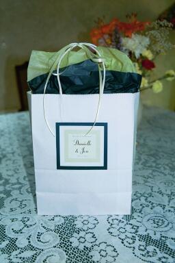 I bought plain white bags from Michaels and ordered labels from myownlabels.com. I ordered tissue paper in our wedding colors from www.buygiftwrap.com. I stuffed the bags with chocolate covered biscotti, North Fork potato chips, bottled water, travel-sized toothpaste and toothbrushes, ocean scented potpourri and a LI Travel Guide.