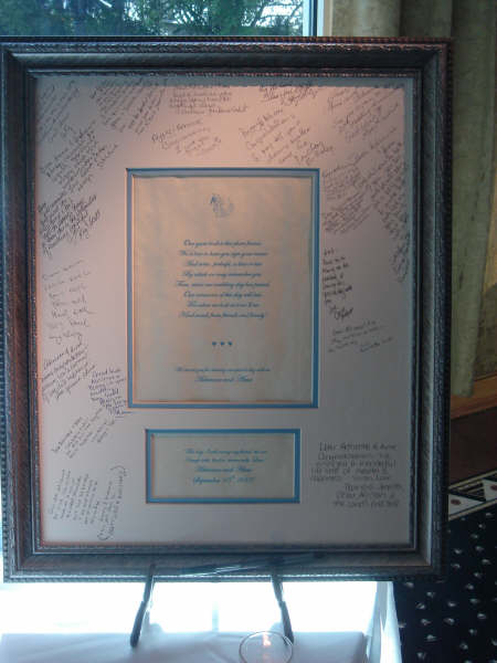 Signing Board: Ebay (I don’t remember the sellers name) : It has a poem in the middle that explains the purpose of the board, then afterward you can remove the poem and put in a pic. I knew I wanted a sign in board and this one worked perfectly. I got a frame from AC Moore and it went off great.