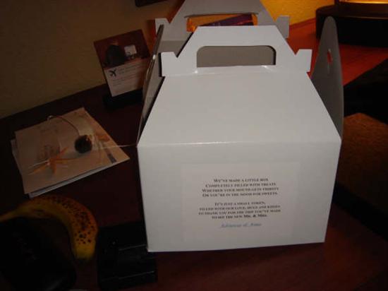 OOT Boxes: I had to order 100 (so if anyone needs any let me know) and my husband and I went to Costco and got the small water bottles, some bars, orbitz and the small bags of chips and put it in. Inside I wrote directions to the church and info on things to do in the area. EVERYONE loved it. People were so surprised to have that waiting for them at the front desk. They all said it added a special touch.