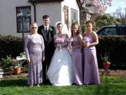 I also got my flowers through Burton’s. I didn’t need centerpieces, since they were provided by the hall, so we got bouquets, boutonnieres, corsages, 2 altar arrangements, and pew bows for the church. As I was getting ready the flowers arrived (about an hour early). Everything was there. I LOVED my bouquet!!! I got lavender roses (to match the BM dresses) and white stephanotis. I think I had about 3 dozen roses, which sounded like a lot at first, since I told them I didn’t want to the bouquet too big, but it was perfect. My bridesmaids had white and purple roses with a darker purple flower (can’t remember the name). The reason they got a B is because as I was pinning my Dad’s boutonniere on, the rose fell off (it was fixed though) and we had to get the flowers for the cake ourselves, since they wouldn’t deliver anything to the hall (because we didn’t get centerpieces through them).