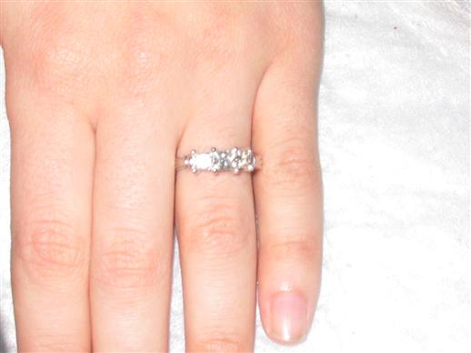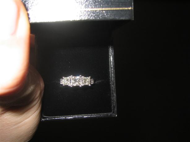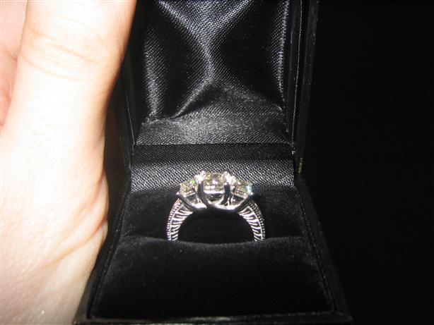 Allright-I had been bothering Gaetano for a year to get engaged, LOL. I told him I wanted a princess cut ring-and when he proposed, it was really a total shock and I told him to S T F U bc I thought he was lying-LOL. I loveddd my ring. But when we went band shopping, no ring fit w/my engagement ring, since it was so high. I got really upset and saw a setting that I fell in love with-Gaetano convinced me to set my 3 stones in there, and if I felt REALLY bad about it, I could always put them back in.