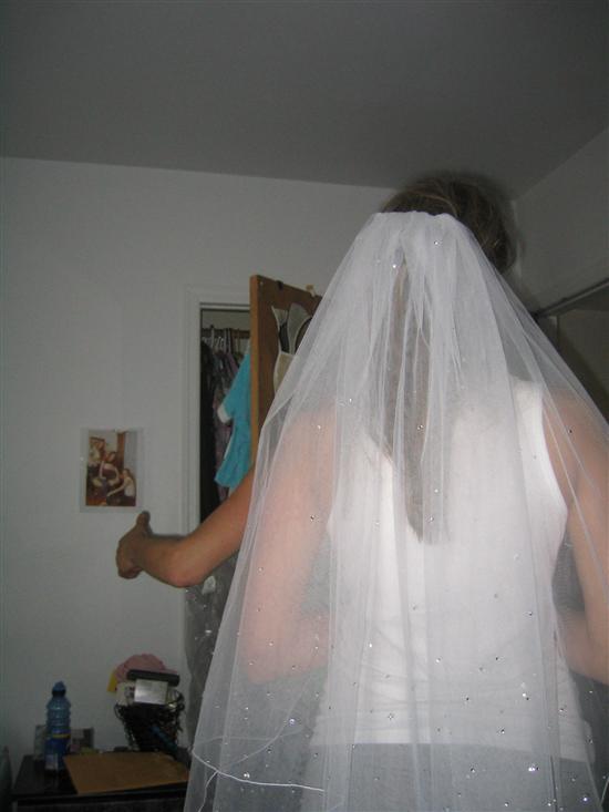 I really don't remember the name of the store, but I LOVED my veil....It was 2 tier, fingertip legnth with different sized rhinestones on it. The lady at the store attached a blusher, and it came out perfect. I kept it on all night.