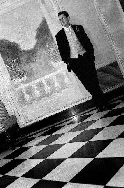 When we arrived at the hall, it was still raining and pretty much lasted through our entire two-hour picture taking session. I felt bad that most of the time, Lia was outside stuck in the rain with an umbrella taking pictures of us! Quite a few of our pictures were taken in the doorway of the lobby to The Woodlands, in the Grand Ballroom and outside the Ballroom. When we walked outside with our umbrellas for a “walking away” shot, when Lia was done, we told her we wanted to drop our umbrellas for a true “in the rain” photo and she was all for it. She shot quickly, got AMAZING photos that she was so excited about, she even showed me in the digital window. We walked in a Nelson was amazed that we even wanted to go outside. Rob and I had so much fun, and we actually didn’t get as wet as we thought we would! The last set of pictures was in the Drawing Room and near the winding staircase. Lia knew how much I loved the black and white checked floor, so she took some shots from the staircase, looking down on us.