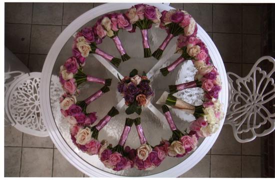 BM DRESSES: Bill Levkoff Style #966, Euro Berry with Euro Champagne Sash (MOHs opposite). The girls’ dresses went more smoothly than mine. They came in on time and fittings went according to plan. I wanted a dress for them that was “Bridal.” I wanted them to stand out and have a special feel, and I believe this was achieved -- the colors, the contrasting flowing sash, the train, etc. I LOVED the way my girls looked.
