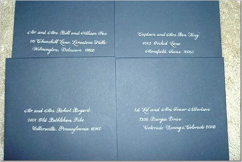 One of my absolute favorite vendors. TALENT. She is absolutely talented. I ran across her website in a Google search (one of MANY searched I embarked on while planning.) After phoning her about prices and doing a bit more calling I realized her prices are on the low end, and I loved her samples on the website. So I went with my gut instinct that told me she would do a great job. When I received the envelopes back in a very quick amount of time I was SHOCKED at how beautiful they were. I had to have white ink because the envelopes were blue and they were flawless. Everyone commented on how lovely the hand calligraphy was, and I was so proud to send out my invitations.