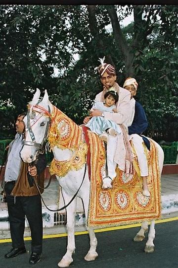 #1: Groom arrives on a white horse (can be an elephant too!) in a procession called baraat - accompanied by a marching band playing music and relatives/guests dancing around the groom. The bride awaits inside.