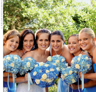 I would like my BoK to be mostly blue flowers. I preffer blue roses but i know they are not natural and not everyone dyes them. Blue Hydrangeas with a mix of ivory or darker white roses or peonies might work just as well.