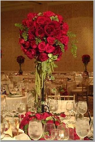 HelloI was wondering if someone could help me out. im getting married 11/8/09 at the inn at new hyde park. Im going for a very romantic and intimate theme for the wedding. I wanted very deep red velevet or black magic roses for my boquet with some crystal accents in it. Im also interested in tall centerpieces that look something like this maybe a little bigger with some different shades of red roses and maybe some other red flowers in them I also love the vine/flower (not sure what it is) that hangs down from the ceterpieces. I dont want candels in the flowers, but i do want lots of candels on the table. and IF POSSIBLE I would love some sort of sparkler hidden in the centerprice that would go off when we get announced to enter the room. we are going to need 20+ centerpieces. How much would a centerpiece like this cost I havent been to a florist yet and I need to know an estimate price range. And also if you have any other great ideas to add.... Thanks!